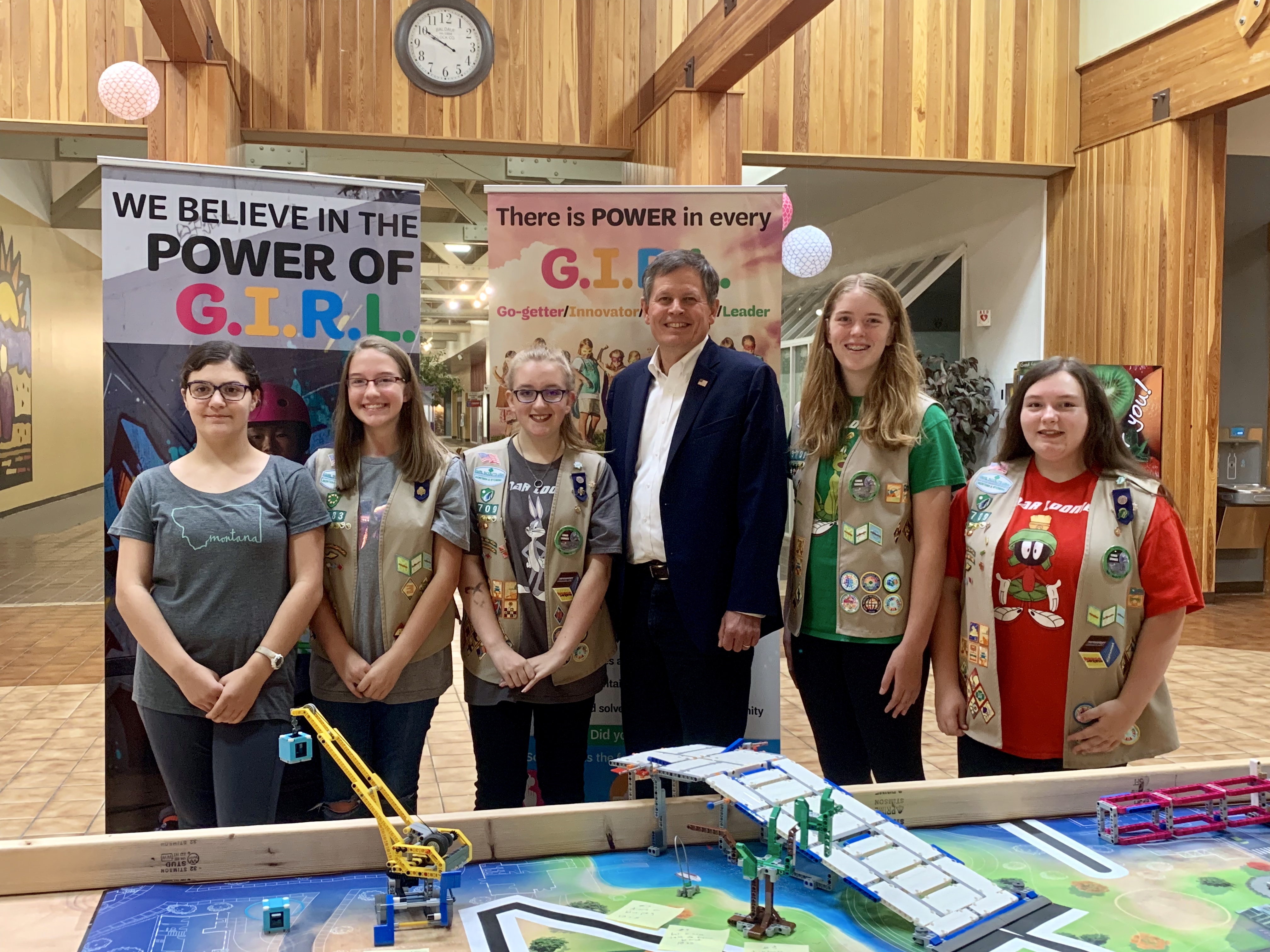 We were honored today to have a visit from U.S. Senator Steve Daines . The team demonstrated the summer NASA #APOLLO50 #ApolloNextGiantLeap challenge and showed their progress with the current First Lego League season. The girls were excited to tell them about their Apollo win at the Montana regional middle school challenge. He was engaged with each girl, interested in what they had to say and encouraged them both in Lego robotics and their future pursuits. Thank you Senator Daines for spending time with us this morning and supporting girls in STEM!