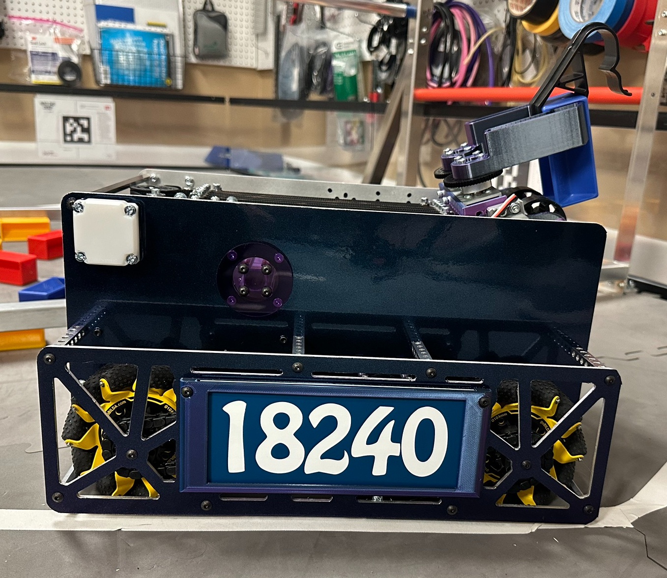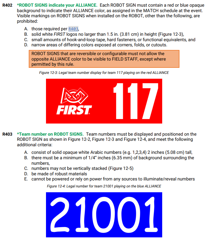 Gone are the days of themeing your team numbers to your robot design. We now have mandated 6.5″ x2.5″ license plates. White horizontal numbers on red and blue backgrounds, interchangable with alliance assignment. Cannot be power dependant. There still need to be 2 of them, but no longer need to be on opposite sides of the bot, just at least 90 degrees from each other. For example, there could be one on the side and one on the top.