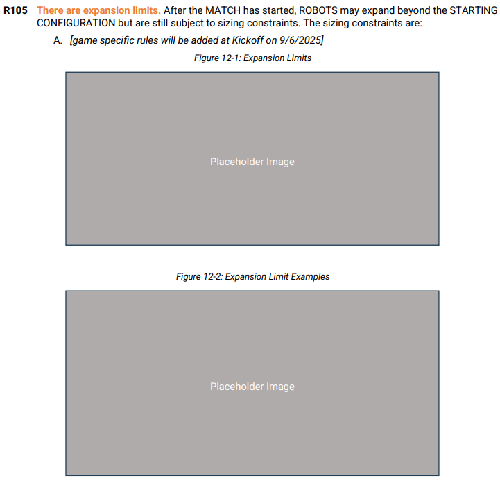 Last season a horizontal expansion limit was introduced. This season, the rule has been updated to “Expansion Limit” and shows 2 place holder boxes for diagrams. We’ll know more at Kickoff.