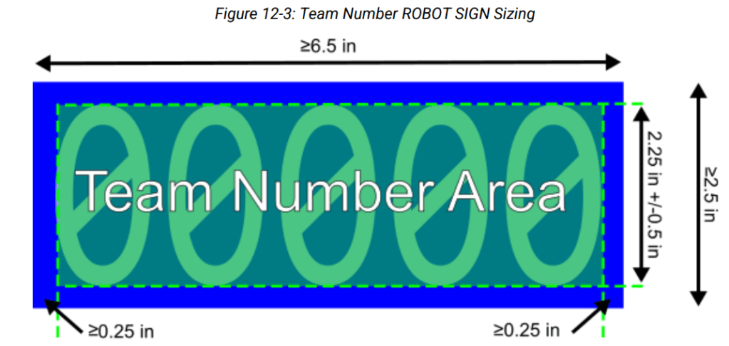 The license plates have changed. Team number now has to be 2.25″ tall. That’s a bummer for those of us that made reusable plates. There must be at least a 1/4″ alliance specific background (border) around the numbers. Which means at minimum your height is 2.75″. Length is still at least 6.5″