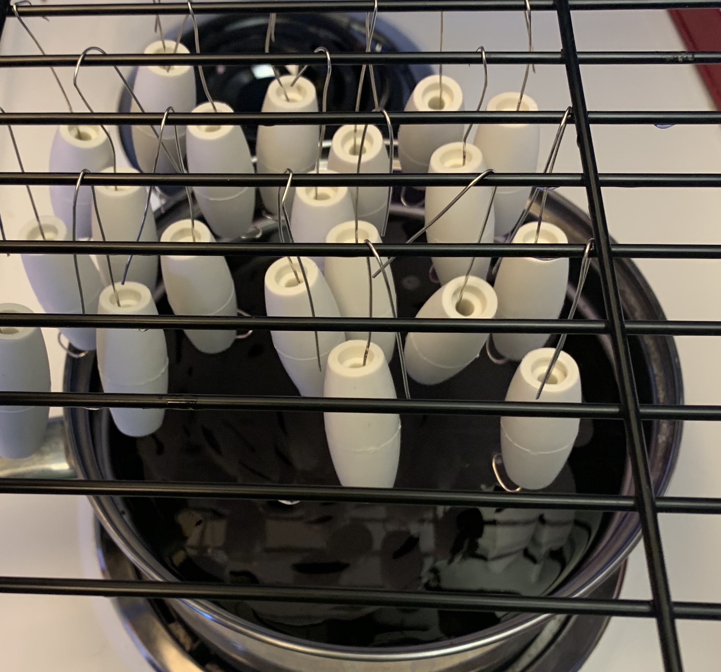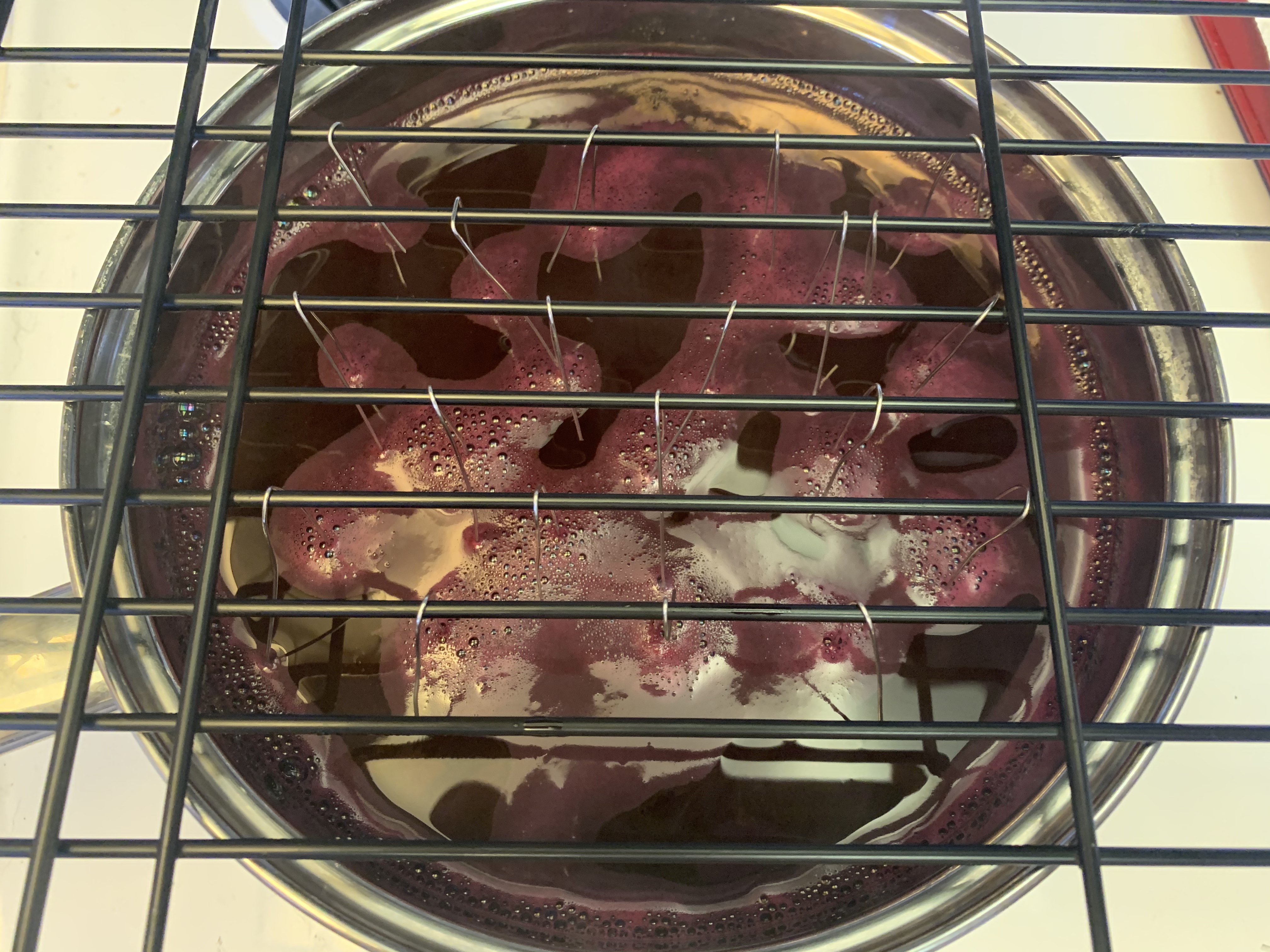 Parts arrived Saturday and we dyed our white goBilda mecanum wheel rollers to our team colors, pink and purple. We used Rit Dye More, and probably too much dye for only a 3 qt pot. We cut 20 ga jewelry wire and hung the rollers from a cookie cooking rack. This was 18 minutes in Super Pink and 15 minutes in Royal Purple. The colors came out darker than intended, but they look great!