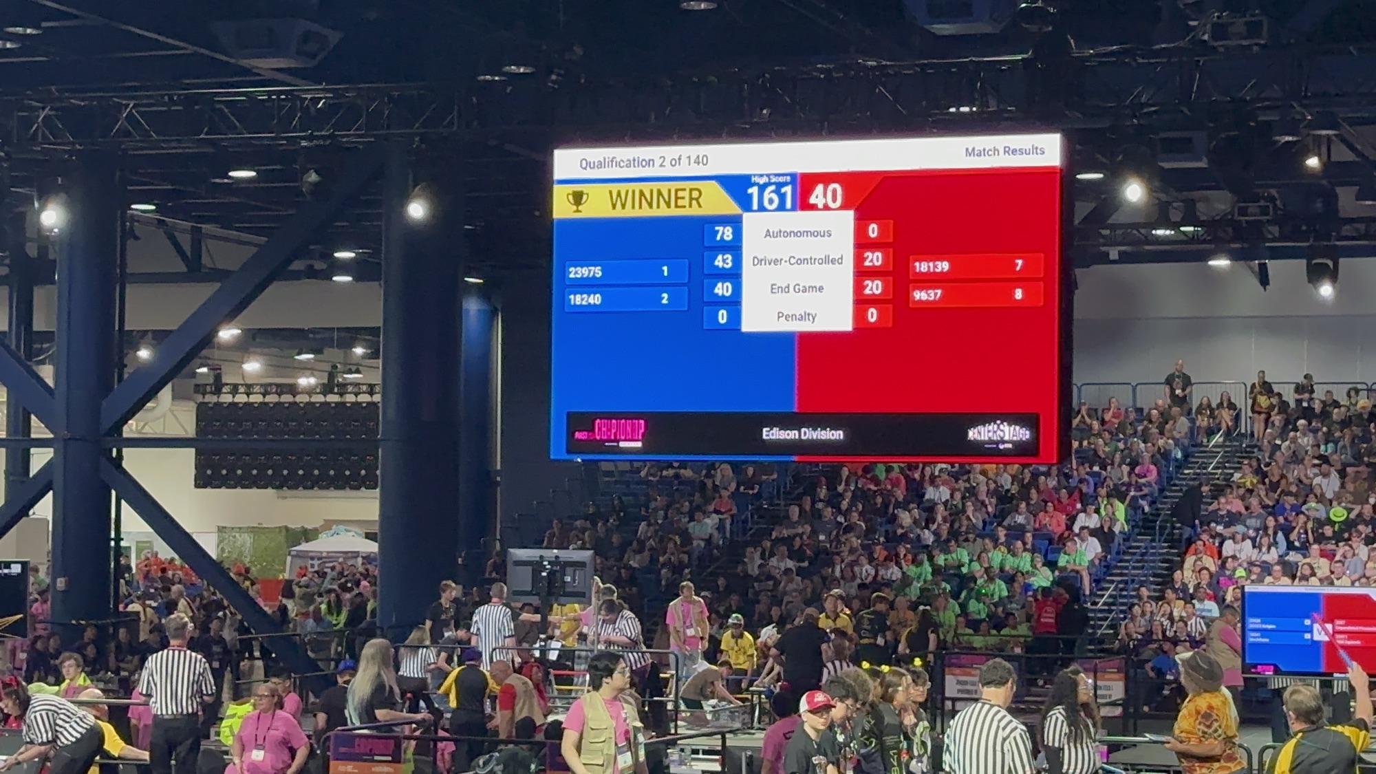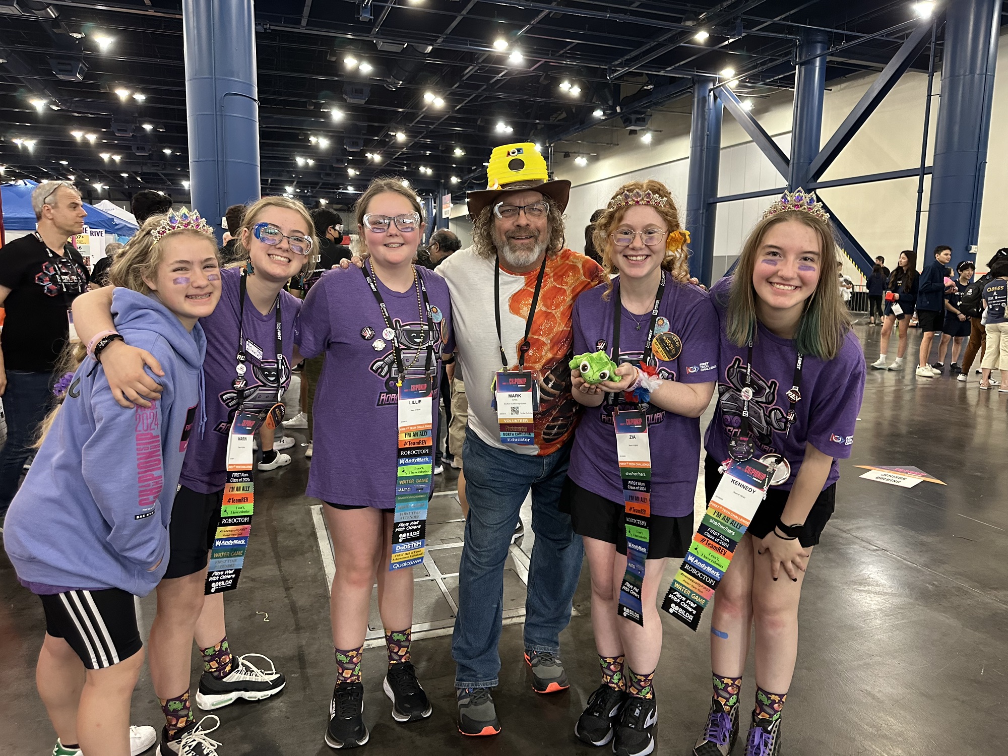 Day 5 – Tiara Friday – Matches in the morning, we were on alliances with teams from Thailand, Nigeria and North Dakota. Our overall tournament result: won 4 lost 6, placed 35th/56 in our division in about the 38th percentile out of 224 teams. This was an improvement over our last showing at worlds in 2022 when we were in the 28th percentile. The team from Eureka also placed 35th in their division. The mascot parade was fun!