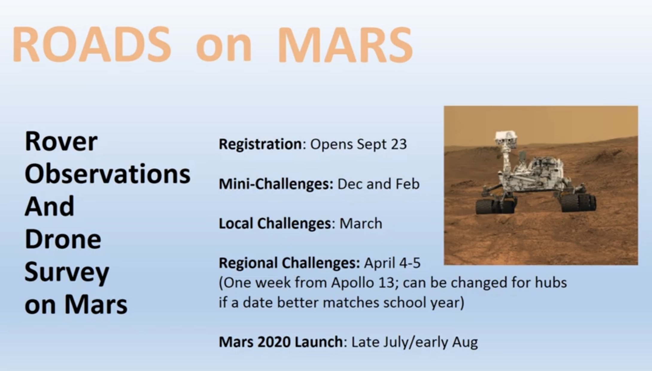 More info to come in a few months, but here’s a preview of next summer’s “The ROADS on Mars” challenge. We anticipate this to be similar to this year’s “Apollo Next Giant Leap” challenge with a combination of drone piloting and Lego rover maneuvering. We’ll be in the high school division next year.